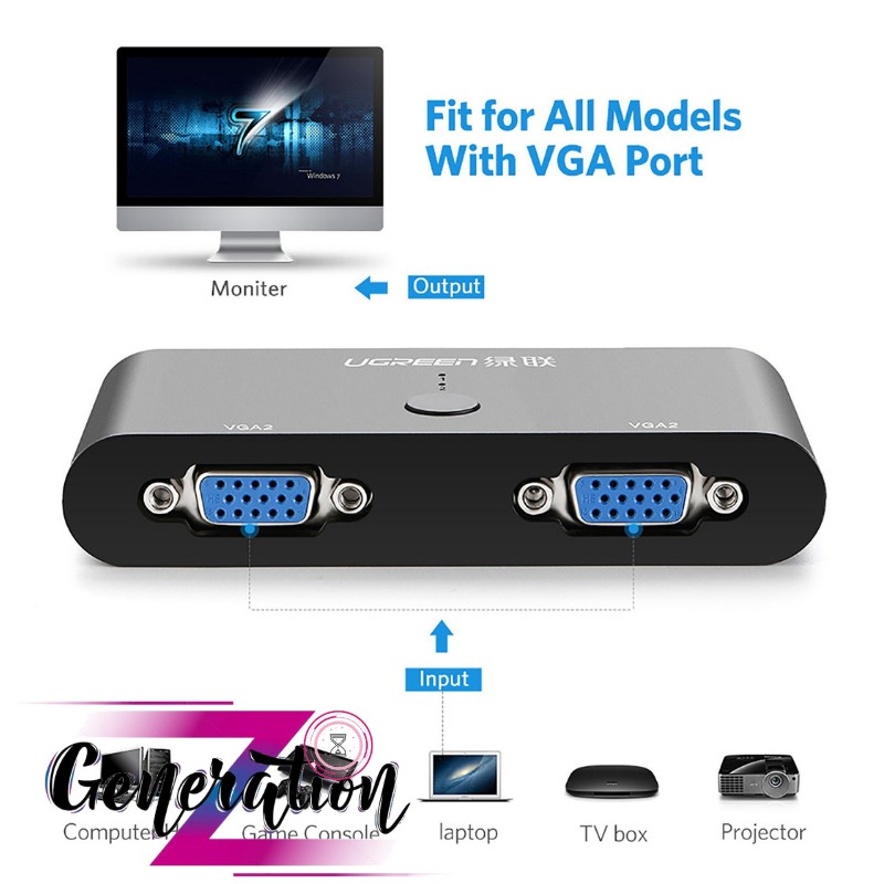 Ugreen 30711 bao gồm hai tính năng, vừa là Bộ chia VGA 1 ra 2 giúp chia sẻ đồng bộ hình ảnh từ một máy tính đến 2 màn hình, hoặc dùng chung một màn hình cho hai thiết bị như một bộ gộp vga cao cấp.