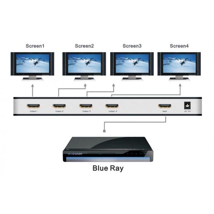 Trong khi một bộ chia HDMI 1 ra 2 được hiển thị, Bộ chia 1 ra 4 cũng hoạt động theo cách tương tự, xuất ra 4 màn hình thay vì 2.