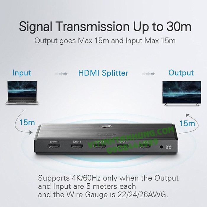 Tính năng: Chia một tín hiệu HDMI 2.0 đầu vào ra 4 màn hình, máy chiếu.