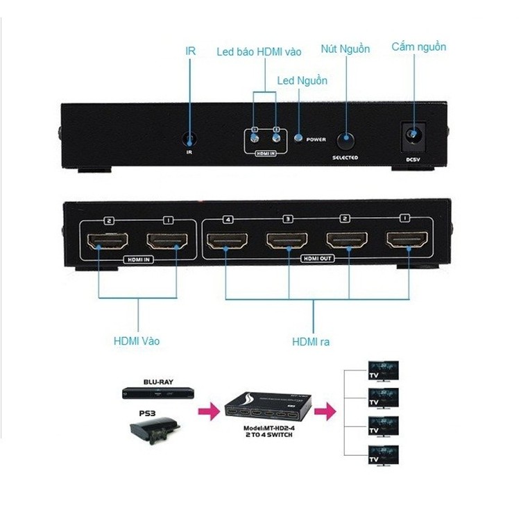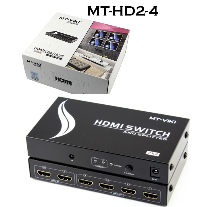 Giới thiệu Bộ chia HDMI 2 ra 4 màn hình MT-Viki MT-HD2-4, Bộ chia HDMI 2 vào 4 ra có điều khiển MT-Viki MT-HD2-4 chính hãng