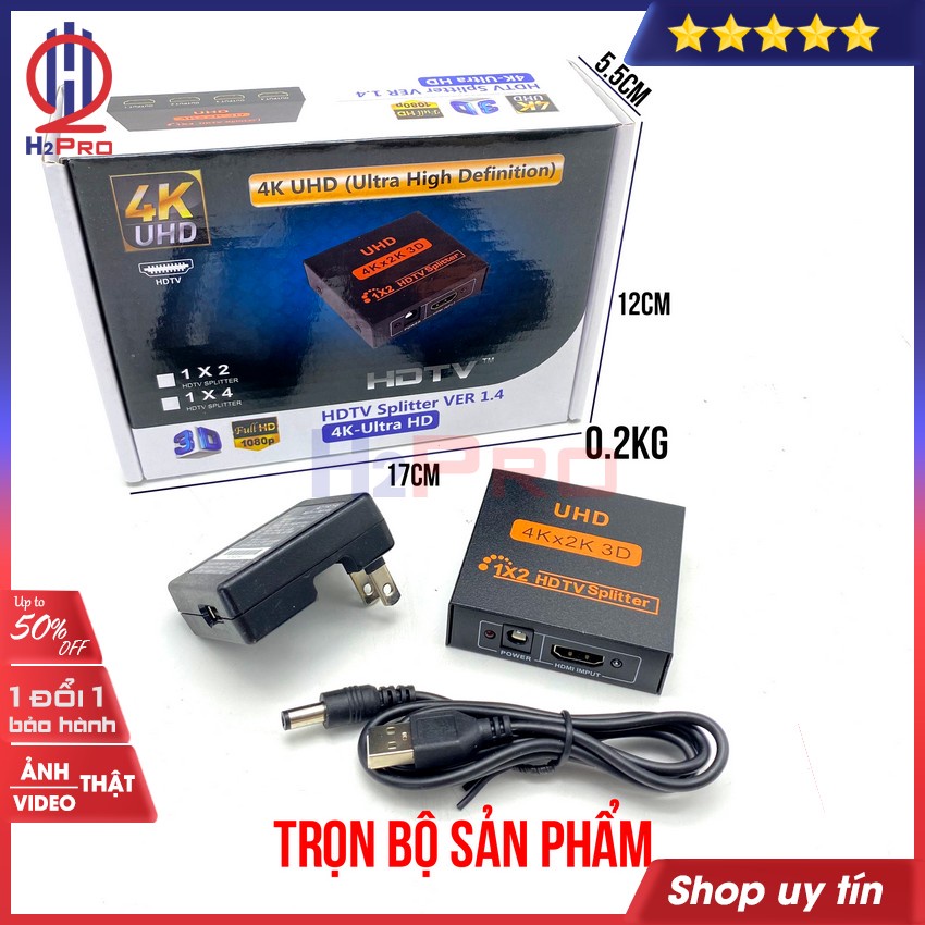 Bộ Chia HDMI Splitter 1 ra 2 H2pro cao cấp chuẩn 4K-3D-chất lượng cao chuẩn đầu vào, hàng hãng (tặng củ sạc 5V-1A 50k)