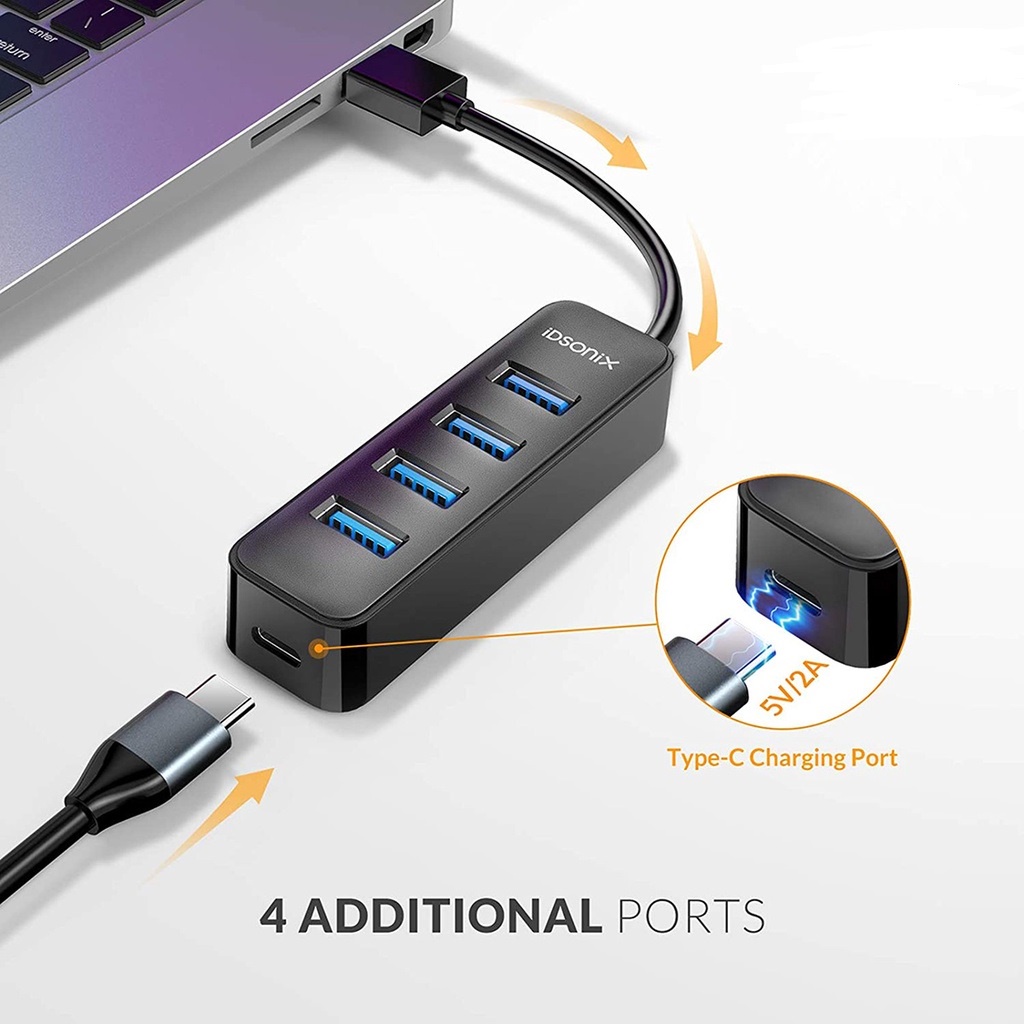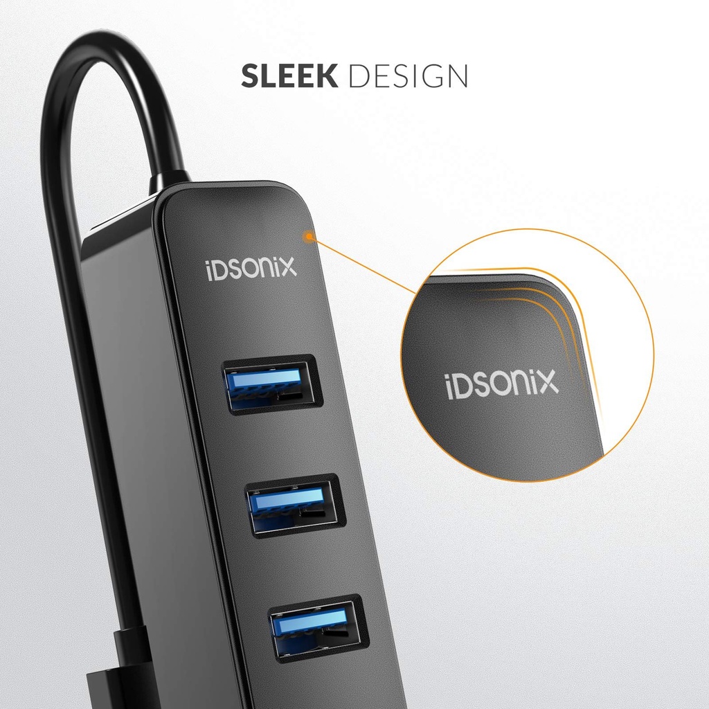 - Hub USB iDsonix IAU3-4A-015-BK chuyển đổi một cổng USB thành 4 cổng, bao gồm hỗ trợ ổ đĩa flash USB, chuột, bàn phím, máy in hoặc bất kỳ thiết bị ngoại vi USB nào khác.