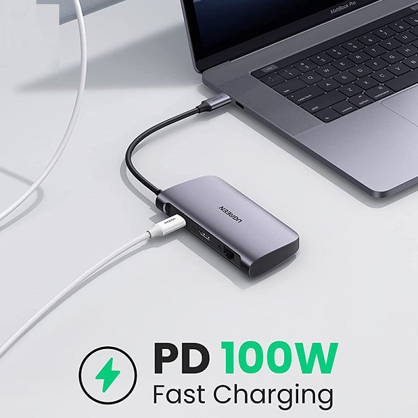 Cáp chuyển đa năng USB-C 7 in 1 cao cấp Ugreen 50852 được sản xuất bởi thương hiệu quốc tế Ugreen với thiết kế nhỏ gọn tinh tế, chất liệu cao cấp bao gồm vỏ nhôm sang trọng, lõi cáp bằng đồng nguyên chất và các chipset xử lý cao cấp, mang đến độ bền vượt trội và khả năng kết nối tối ưu nhất. Ngoài ra, nhà sản xuất còn trang bị thêm cổng USB-C giúp kết nối sạc cho máy tính, laptop của bạn ngay khi đang xử dụng thiết bị này.