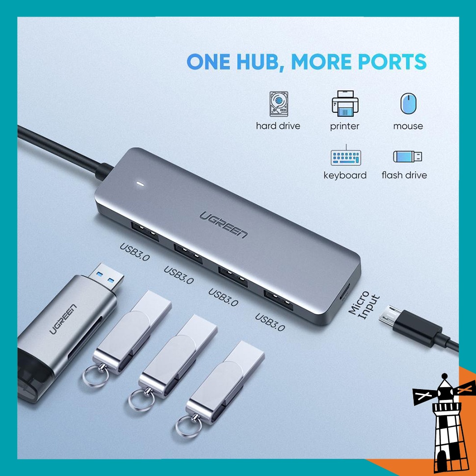 Bộ Chia Hub USB Type C Ra 4 Cổng USB 3.0 Ugreen 70336 (Trợ Nguồn MicroUSB) Vỏ NhựaGiới Thiệu sản phẩm Ugreen 70366: khung vỏ bằng nhựa nhưng cổng kết nối bằng kim loại.