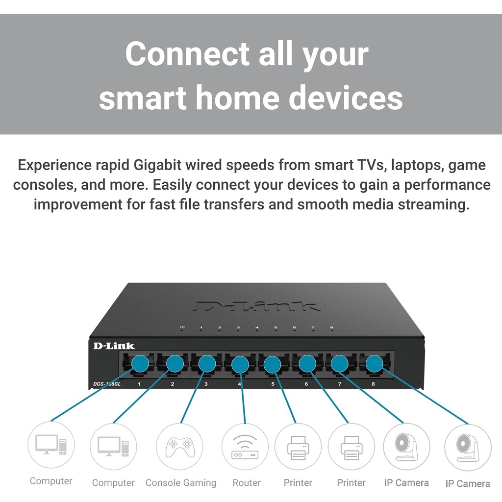 Switch 8 Port Gigabit D-Link DGS-108GLBộ chuyển đổi Ethernet 8 cổng Gigabit Ethernet DGS-108GL từ D-Link cung cấp 8 cổng cảm biến tự động tốc độ cao để kết nối nhiều thiết bị máy tính với mạng của bạn. Khi bạn đã kết nối chuyển sang mạng của mình qua một cổng, bạn sẽ có bảy cổng khác để kết nối máy tính, máy in, máy quét, bộ nhớ, thiết bị sao lưu và hơn thế nữa. Hỗ trợ Chất lượng Dịch vụ (QoS) có nghĩa là việc chuyển đổi sẽ ưu tiên lưu lượng mạng nhạy cảm với sự chậm trễ, chẳng hạn như video hoặc cuộc gọi VoIP.