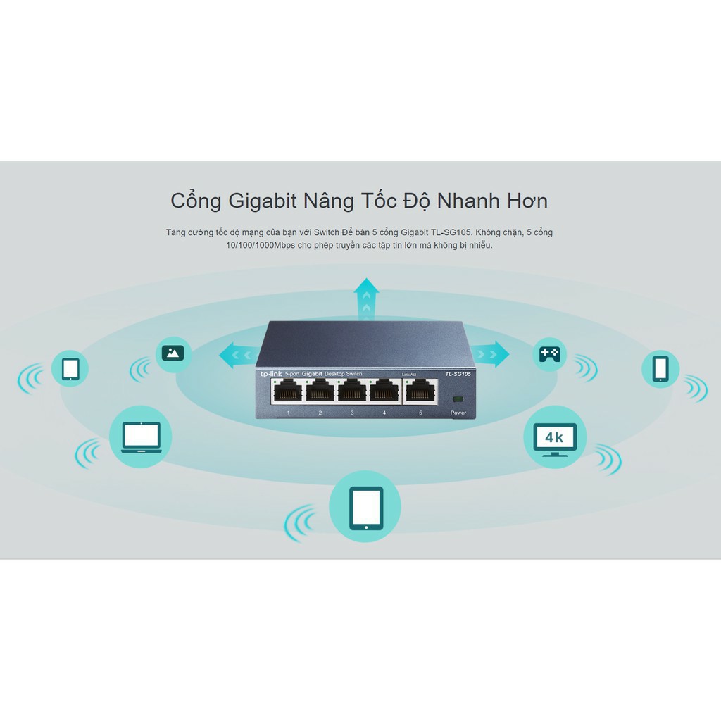 - Tăng cường tốc độ mạng của bạn với Switch Để bàn 5 cổng Gigabit TL-SG105. Không chặn, 5 cổng 10/100/1000Mbps cho phép truyền các tập tin lớn mà không bị nhiễu.