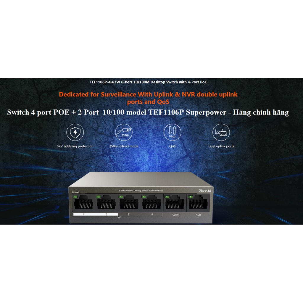Bộ chia mạng Switch 4 port POE + 2 Port 10/100 Tenda TEF1106P Superpower - Hàng chính hãng