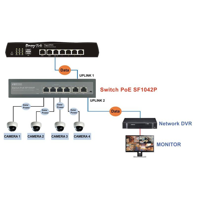 • 2 cổng Uplink 10/100 Mbps RJ45 trong đó 1 cổng kết nối modem hoặc switch trung tâm, 1 cổng kết nối với đầu ghi.