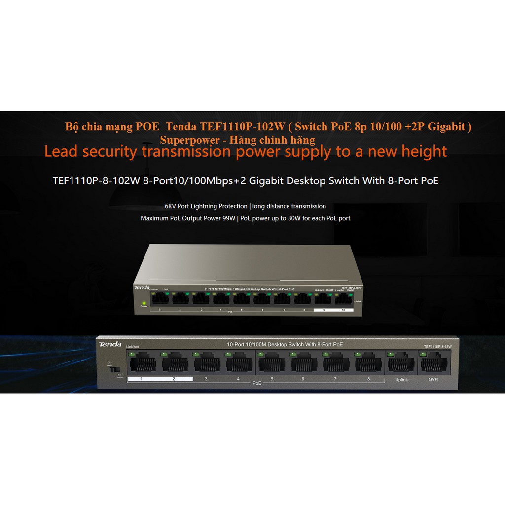 Bộ chia mạng Switch POE Tenda TEF1110P-102W ( Switch PoE 8p 10/100 +2P Gigabit )Superpower - Hàng chính hãng