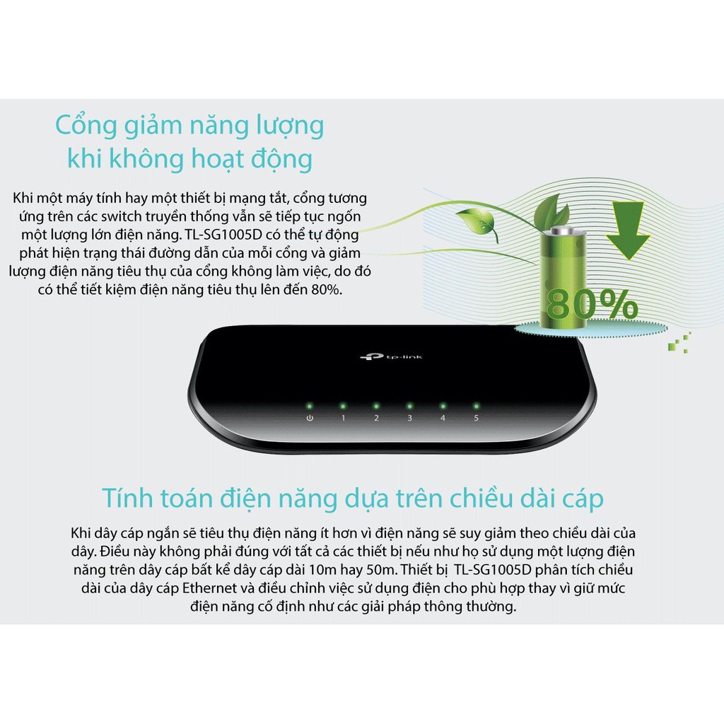 ✔️ Cung cấp sự thiết kế tiêu thụ điện ít hơn. Với công nghệ tiết kiệm điện năng động, TL-SG1005D có thể tiết kiệm tiêu thụ điện đến 70%, làm cho nó thành một giải pháp thân thiện với môi trường cho căn hộ và văn phòng của bạn.