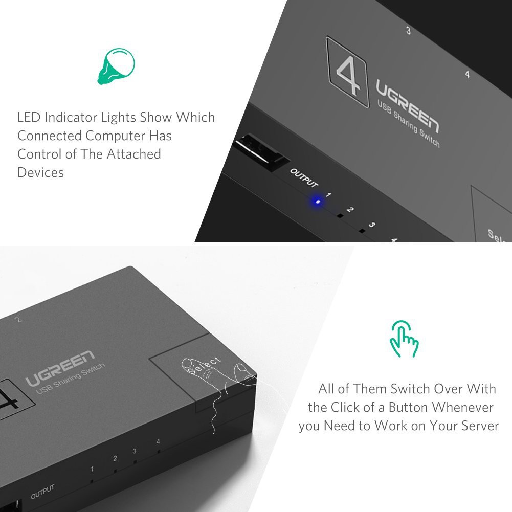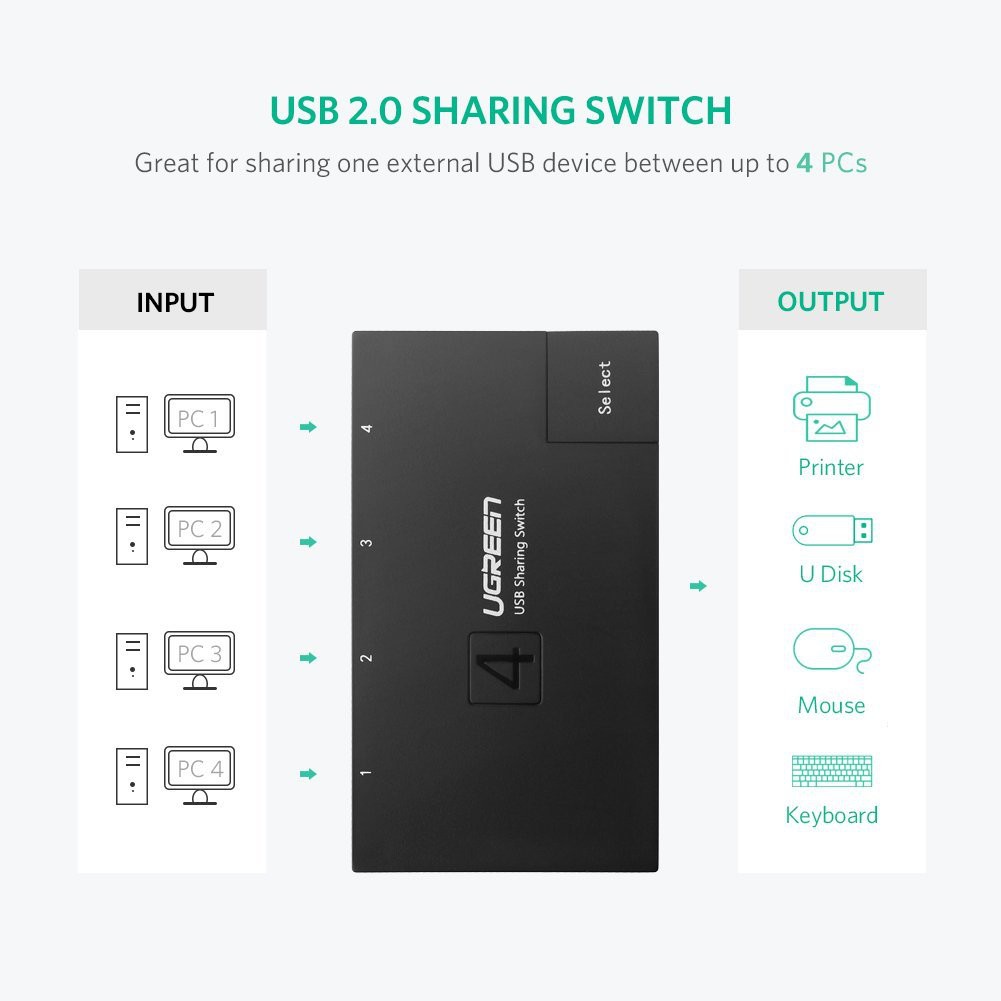 • USB 2.0 Sharing Switch Ugreen 30346 là thiết bị lý tưởng dùng để chia sẻ thiết bị USB như máy in, USB, máy quét, ổ đĩa gắn ngoài hoặc các thiết bị ngoại vi USB khác với 4 máy tính (một máy tính có quyền truy cập tại một thời điểm), bạn có thể dễ dàng chuyển đổi giữa bốn máy tính này chỉ với một phím bấm.