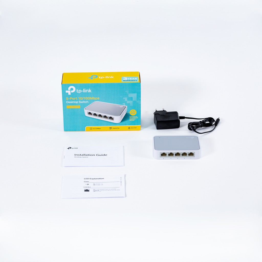 Chính sách bảo hành 1 đổi 1 trong vòng 2 năm nếu có lỗi kĩ thuật kể từ ngày mua.5 cổng RJ45 10/100Mbps với kỹ thuật chiếm quyền điều khiển cáp (Auto-Negotiation) và hỗ trợ tính năng MDI / MDIX