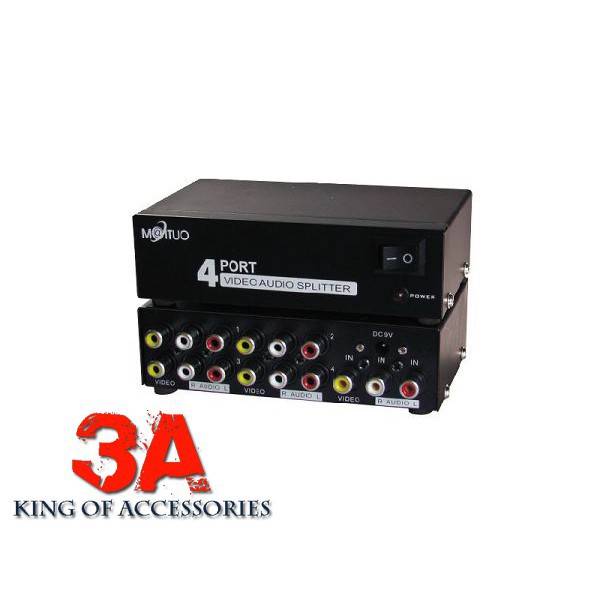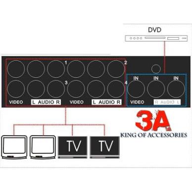 Bạn có 1 thiết bị phát tín hiệu AV như đầu đĩa, máy chiếu, máy chơi game,.....muốn xuất 1 lúc ra 4 màn hình.3A xin giới thiệu với các bạn bộ chia AV, audio chính hãng có thể giúp bạn chia sẻ hình ảnh ra nhiều tivi 1 lúc.