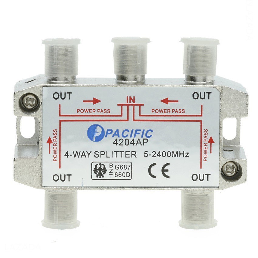 Bộ chia truyền hình cáp PACIFIC 1 Ra 4 Tivi - 4204APBộ chia truyền hình cáp từ 1 ra 4 Tivi, Chia tín hiệu truyền hình cáp thường (Analog) và truyền hình cáp KTS HDTV, KTS SDTV, Bộ chia tín hiệu cao tần 5-2400 MHZ
