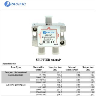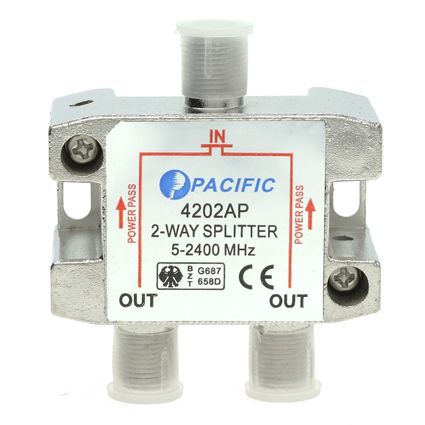 Bộ chia truyền hình cáp PACIFIC 4202AP 1 Ra 2 TiviBộ chia truyền hình cáp từ 1 ra 2 Tivi, Chia tín hiệu truyền hình cáp thường (Analog) và truyền hình cáp KTS HDTV, KTS SDTV, Bộ chia tín hiệu cao tần 5-2400 MHZ