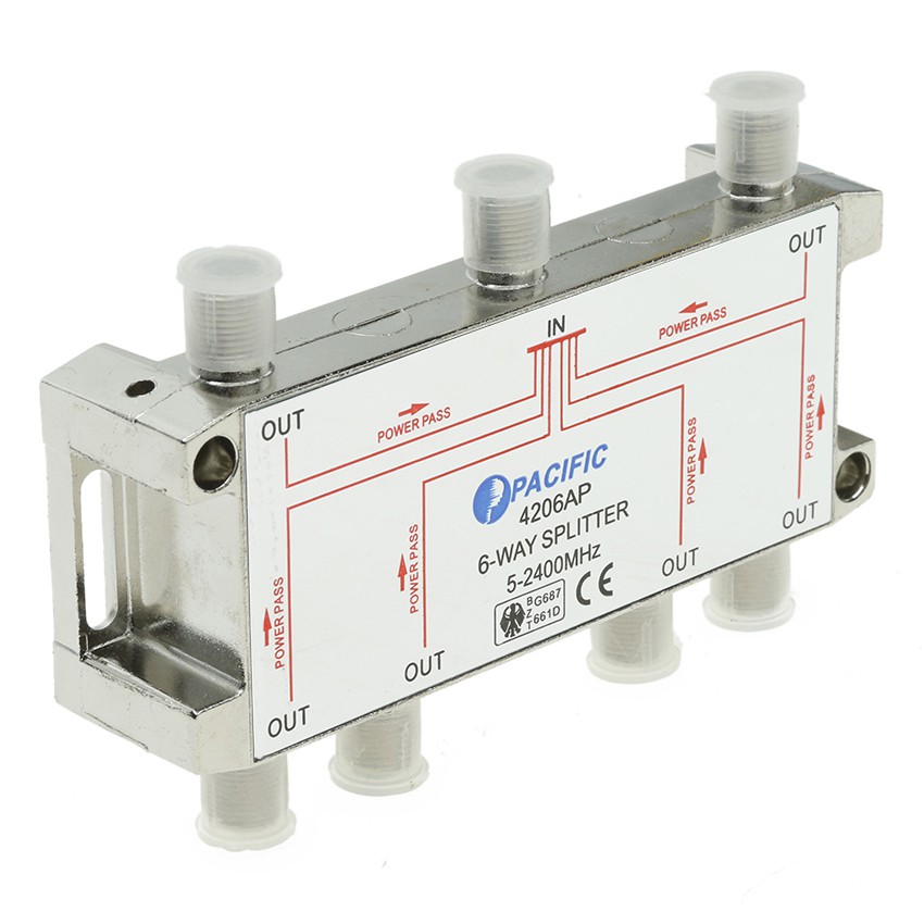 Bộ chia truyền hình cáp PACIFIC 1 Ra 6 Tivi - 4206APBộ chia truyền hình cáp từ 1 ra 6 Tivi, Chia tín hiệu truyền hình cáp thường (Analog) và truyền hình cáp KTS HDTV, KTS SDTV, Bộ chia tín hiệu cao tần 5-2400 MHZ