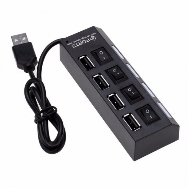 Thiết bị chia cổng USB 4 port còn được thiết kế thêm 4 công tắc bật tắt tương ứng với 4 cổng USB. Khi bạn không dùng hết số cổng USB bạn có thể nhấn công tắc bật, khi ấy đèn sẽ sáng và bạn có thể sử dụng cổng USB đó và nhấn công tắc tắt để tắt các cổng USB còn lại và đèn chỉ sáng ở công tắc bạn muốn bật. Điều này giúp bạn vừa tiết kiệm được điện, vừa tránh lãng phí cổng usb không sử dụng làm giảm đường truyền, vừa giúp báo hiệu cho bạn biết cổng USB đó có còn sử dụng được hay không hay bị mất điện.