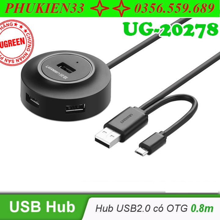 Hub Chia USB 4 Cổng 2.0 + OTG Ugreen 20278Bộ chia USB Ugreen 20278 chuẩn USB 2.0 ra 4 Cổng tích hợp OTG là giải pháp cho việc mở rộng cổng usb trên máy tính bàn, laptop để cắm các thiết bị ngoại vị như chuột, bàn phím, ổ cứng di động, sạc điện thoại ...v.v.. Đặc biệt hỗ OTG giúp chia USB trên điện thoại.