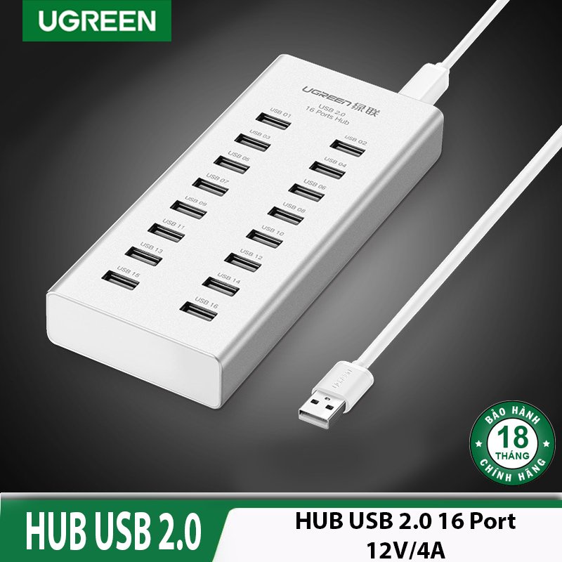 Bộ Chia Cổng USB 2.0 16 Cổng Cao Cấp Ugreen 20298Hub USB 2.0 có nguồn 12V 4A 16 Cổng Cao cấp Ugreen 20298 là phụ kiện cao cấp giúp chia cổng usb trên máy tính, laptop... của bạn thêm 16 cổng usb 2.0 với tốc độ truy xuất dữ liệu lên đến 480Mbps, với nguồn cấp phụ 12V giúp thiết bị có khả năng sao chép, truyền tải tập tin số dung lượng lớn ổn định và nhanh chóng. Với nhiều lớp bảo vệ quá dòng, quá áp, chống ngắt đột ngột... Ugreen 20298 thật sự là một thiết bị hoàn hảo cho mọi nhu cầu mở rộng kết nối USB 2.0 của bạn.