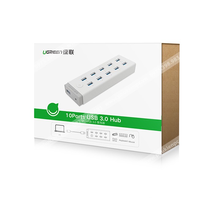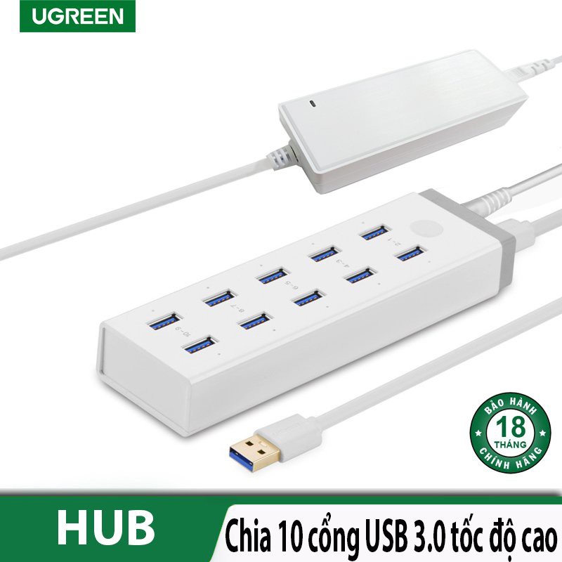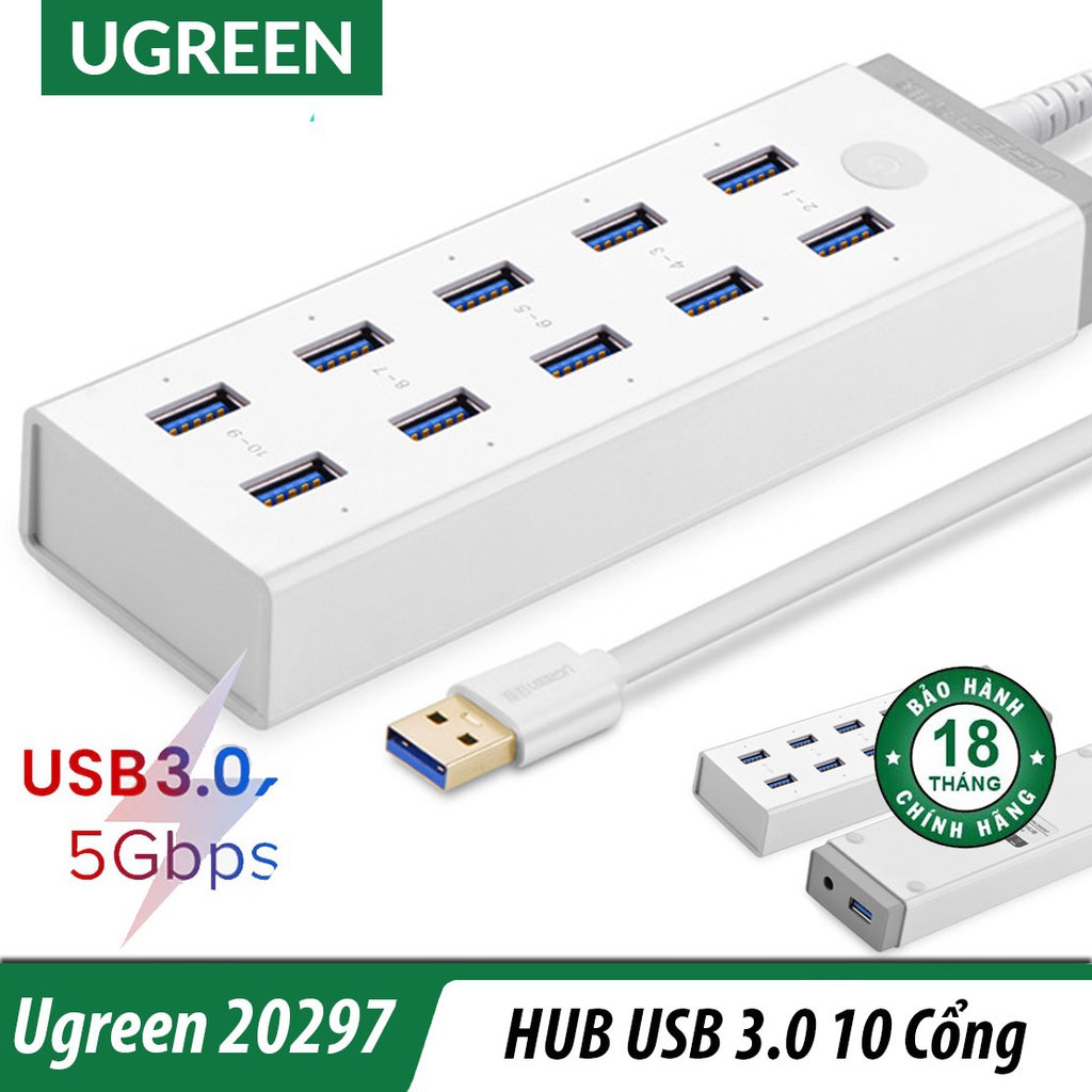 HUB USB 10 Cổng USB 3.0 Cao Cấp Có Nguồn 12V 5A Chính Hãng Ugreen 20297Hub USB 3.0 có nguồn 12V 5A 10 Cổng Cao cấp Ugreen 20297 là phụ kiện cao cấp giúp chia cổng usb trên máy tính, laptop... của bạn thêm 10 cổng usb 3.0 với tốc độ truy xuất dữ liệu lên đến 5Gbps, với nguồn cấp phụ 12V giúp thiết bị có khả năng sao chép, truyền tải tập tin số dung lượng lớn ổn định và nhanh chóng. Với nhiều lớp bảo vệ quá dòng, quá áp, chống ngắt đột ngột... Ugreen 20297 thật sự là một thiết bị hoàn hảo cho mọi nhu cầu mở rộng kết nối USB 3.0 của bạn.