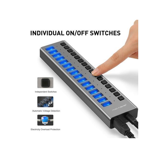 - Bộ chia USB 16 cổng này có công tắc BẬT và TẮT tích hợp với đèn LED chỉ báo cho mỗi cổng. Bạn có thể bật / tắt cổng USB riêng biệt mà không cần phải rút toàn bộ bộ chia.