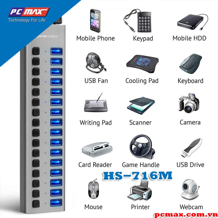 HUB USB 3.0 có nguồn điện 16 port 90W 12V / 7.5A cho cứng di động ACASIS HS-716M - Hàng chính hãngUSB Hub 3.0 của chúng tôi có 10 Cổng truyền dữ liệu USB, giúp bạn dễ dàng kết nối đồng thời nhiều thiết bị USB với PC hoặc máy tính xách tay, chẳng hạn như bàn phím, chuột, đầu đọc thẻ, webcam và hơn thế nữa.