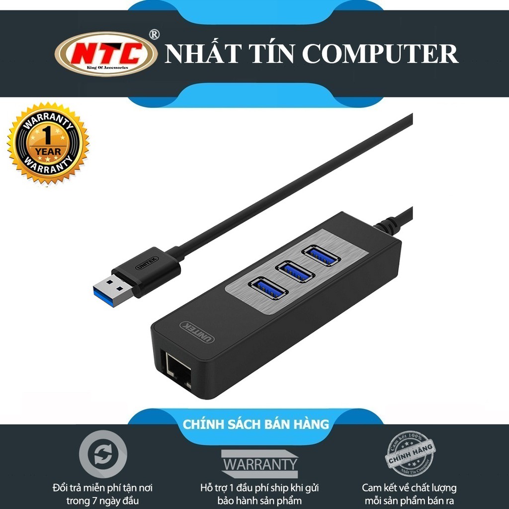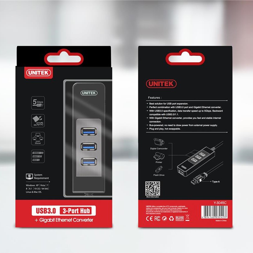 Bộ chia USB 3.0 ra 3 cổng USB 3.0 with Lan Gigabit Unitek Y-3045C (Đen)Bộ chia USB 3.0 ra 3 cổng USB 3.0 Unitek Y-3095 with Lan Gigabit Bộ chia USB 3.0 ra 3 cổng USB 3.0 Unitek Y-3095 with Lan Gigabit là một USB hub với thiết kế nhỏ gọn, tỉ mỉ và độc đáo. Cùng với chuẩn giao tiếp siêu nhanh USB 3.0 mới nhất, giúp bạn di chuyển dữ liệu của bạn nhanh hơn 10 lần so với USB 2.0. Thêm vào đó, bộ chia USB 3.0 ra 3 cổng USB 3.0 Unitek Y-3095 with Lan Gigabit được trang bị thêm một bộ chuyển đổi Gigabit Ethernet, đây là giải pháp tốt nhất cho những dòng máy tính xách tay / Ultrabook / Surface / Macbook mà không có cổng Ethernet (RJ45). Hỗ trợ mạng IPv4 / IPv6, tiết kiệm điện năng và hỗ trợ Wake-On-LAN. Ngoài ra, bộ chia USB 3.0 ra 3 cổng USB 3.0 Unitek Y-3095 with Lan Gigabit hỗ trợ cho cả Windows, Linux và MacOS, driver download miễn phí tại trang chủ của Unitek.