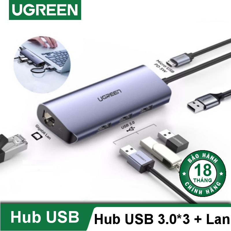 Bộ chia USB 3 cổng+Lan Cao Cấp Ugreen 60812 60719 CM266 (USB 3.0/Lan Gigabit 1000Mbps)
