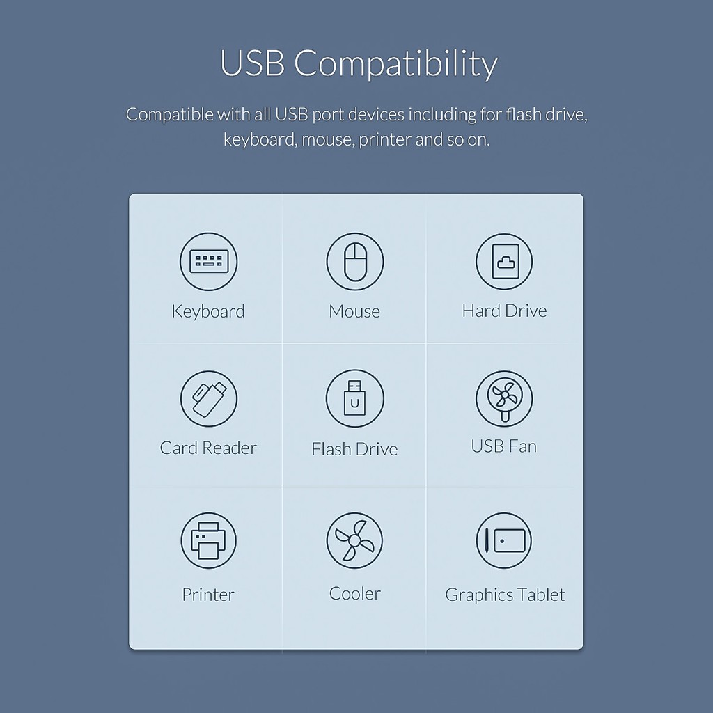 Hỗ trợ ổ cứng ngoài, bàn phím, chuột, đĩa U, đầu đọc thẻ, bộ tản nhiệt USB, pin sạc dự phòng, máy in, điện thoại di động, máy tính bảng, v.v.