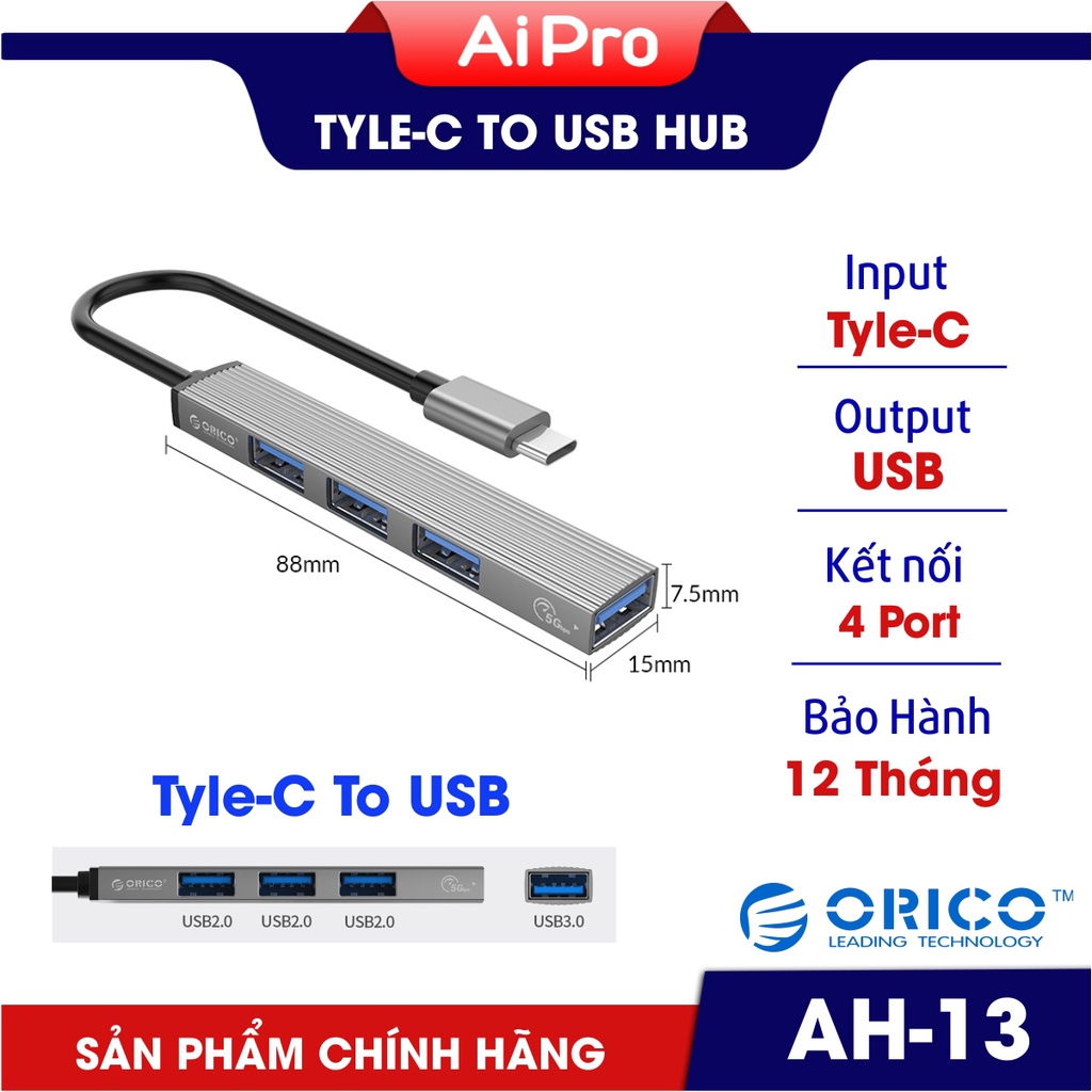 - Đặc điểm nổi bật của bộ chia USB Orico AH-13 Từ Type-C ra 4 Cổng USB chất lượng cao. Sử dụng cho tất cả các thiết bị có chuẩn kết nối Type-C.