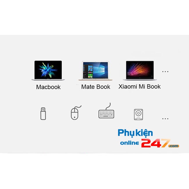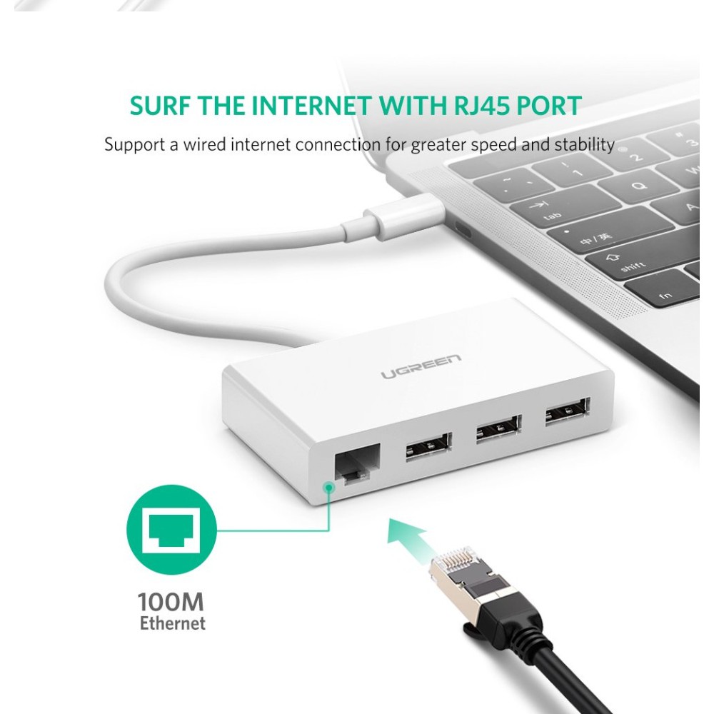 Bộ chia USB type C tích hợp cổng mạng LAN giúp Macbook của bạn có thể kết nối thêm với các thiết bị có cổng USB như phím, chuột...ngoài ra còn có thể kết nối với mạng dây tốc độ 10/100Mbps thông qua cổng mạng Lan