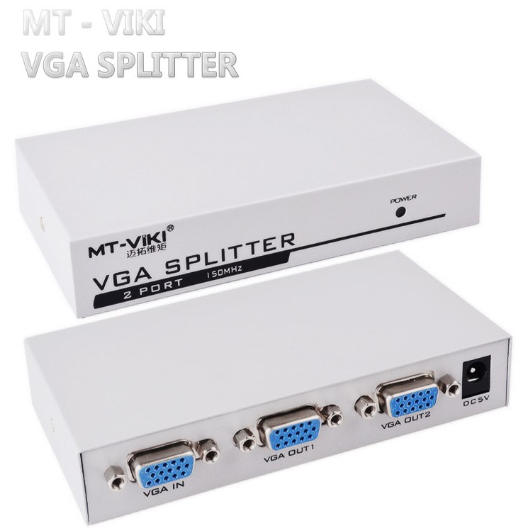 Bộ chia VGA 1 ra 2 cổng MT-VikiBộ chia màn hình Viki MT-1502 2 port VGA Splitter , 1 cây máy tính (hoặc 1 laptop) ra 2 màn hình và máy chiếu.