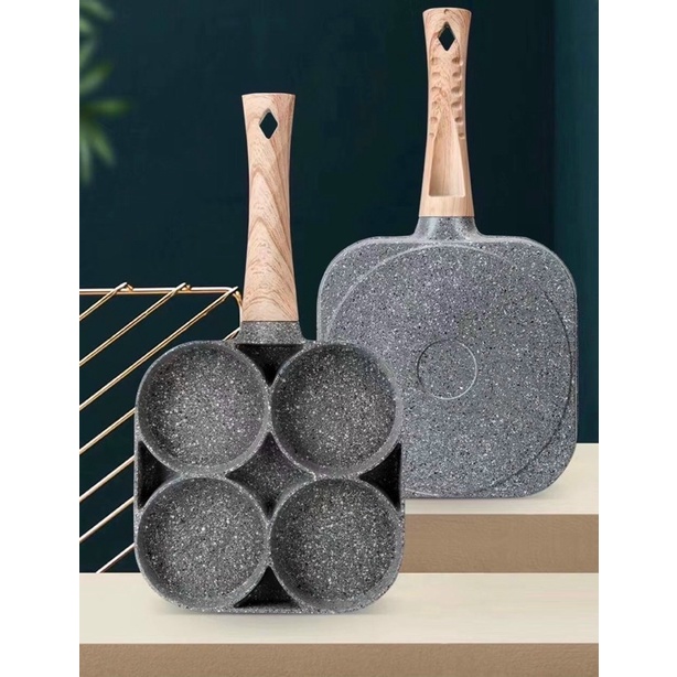 ✍ Chảo Chiên Rán Trứng Làm Bánh 4 Ngăn 4 Lỗ Chống Dính- Chống Dính Tay Cầm Gỗ