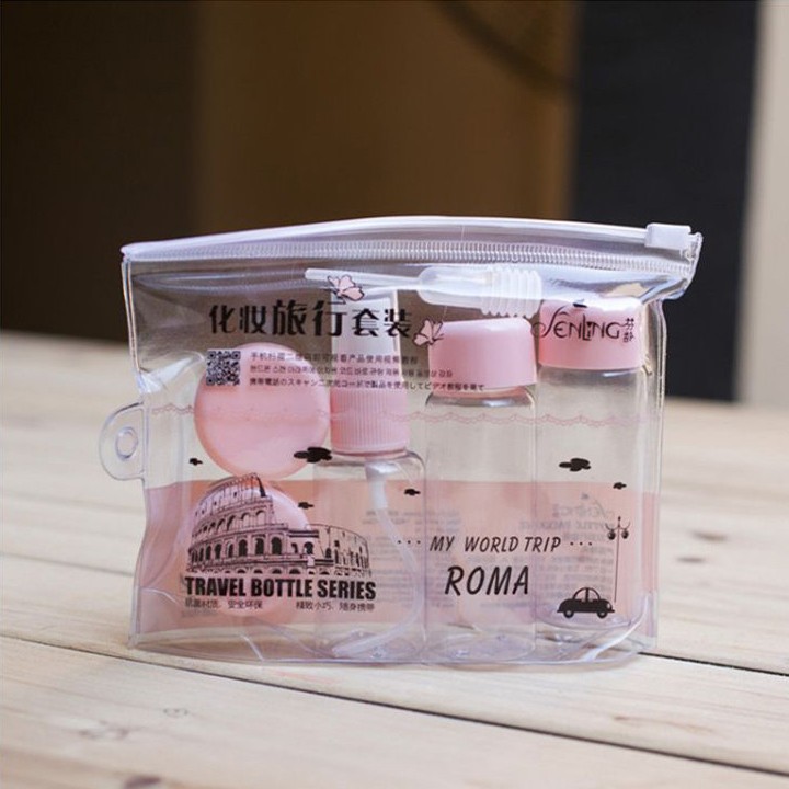 Bộ chiết mỹ phẩm du lịch 7 món xinh xắn tiện dụng cho bạn hay đi du lịch và công tác.Đầy đủ những dụng cụ chiết mỹ phẩm: dầu gội, sữa tắm, kem dưỡng da, dung dịch dưỡng tóc…