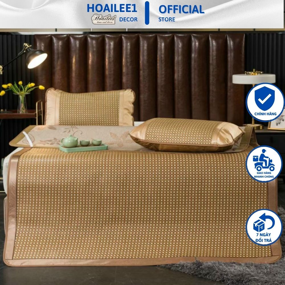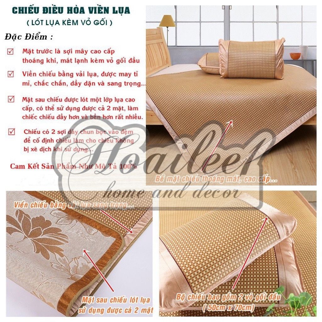 Đây là phân loại chiếu về sản phẩm giống như chiếu điều hòa viền lụa lót lụa, chỉ khác nhau là chiếu điều hòa bộ có thêm 2 vỏ gối mây kích thước 45cm x 65cm, ( riêng phân loại 80cm x 190cm , 90cm x 190cm, 1m x 190cm, 1m2 x 1m9 là có 1 vỏ gối ) vỏ gối được làm bằng chất liệu mây và lụa giống như chiếu điều hòa lụa