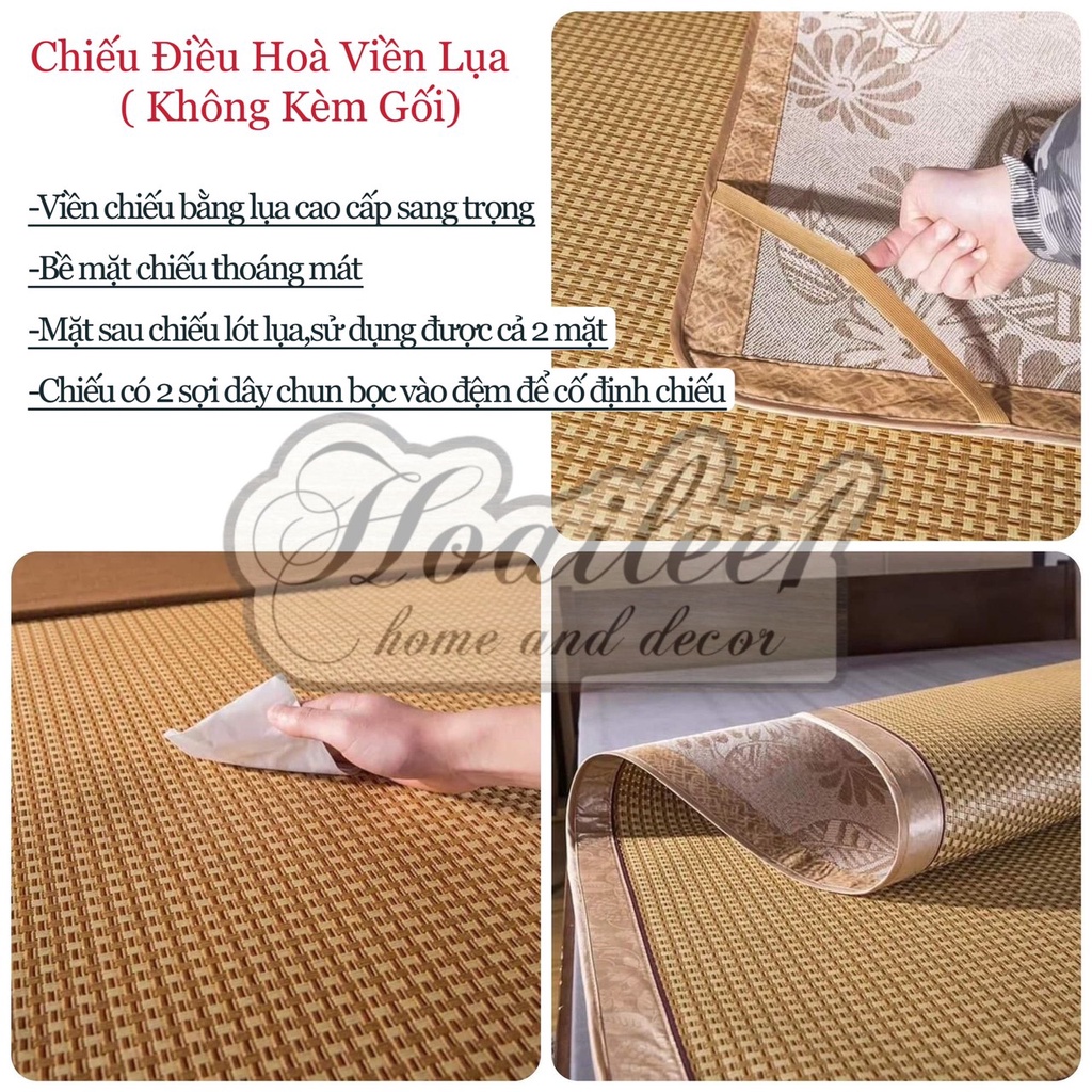 đặc điểm của chiếu điền hòa viền lụa : Đây là sự cả tiến của chiếu điền hòa viền vải. loại chiếu này có mặt trên giống chiếu điều hòa viền vải, có độ mát tương đương nhau, nhưng loại chiếu này có viền được may bằng lụa vàng nên độ thẩm mỹ cao hơn, ngoài ra mặt phía sau còn đượt lót thêm 1 lớp lụa dầy phía sau làm tăng độ bền cũng như chất lượng của sản phẩm. Độ bền sử dụng từ 3-4 năm và đặc biệt có thể sử dụng được 4 mùa quanh năm , Hiện tại loại chiếu này shop đang cung cấp các kích thước như sau : 1m2 x 1m9 , 1m5 x 1m9 , 1m6 x 2m, 1m8x2m, 2mx2m2