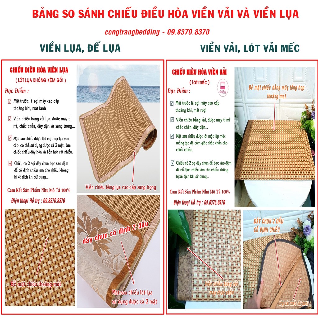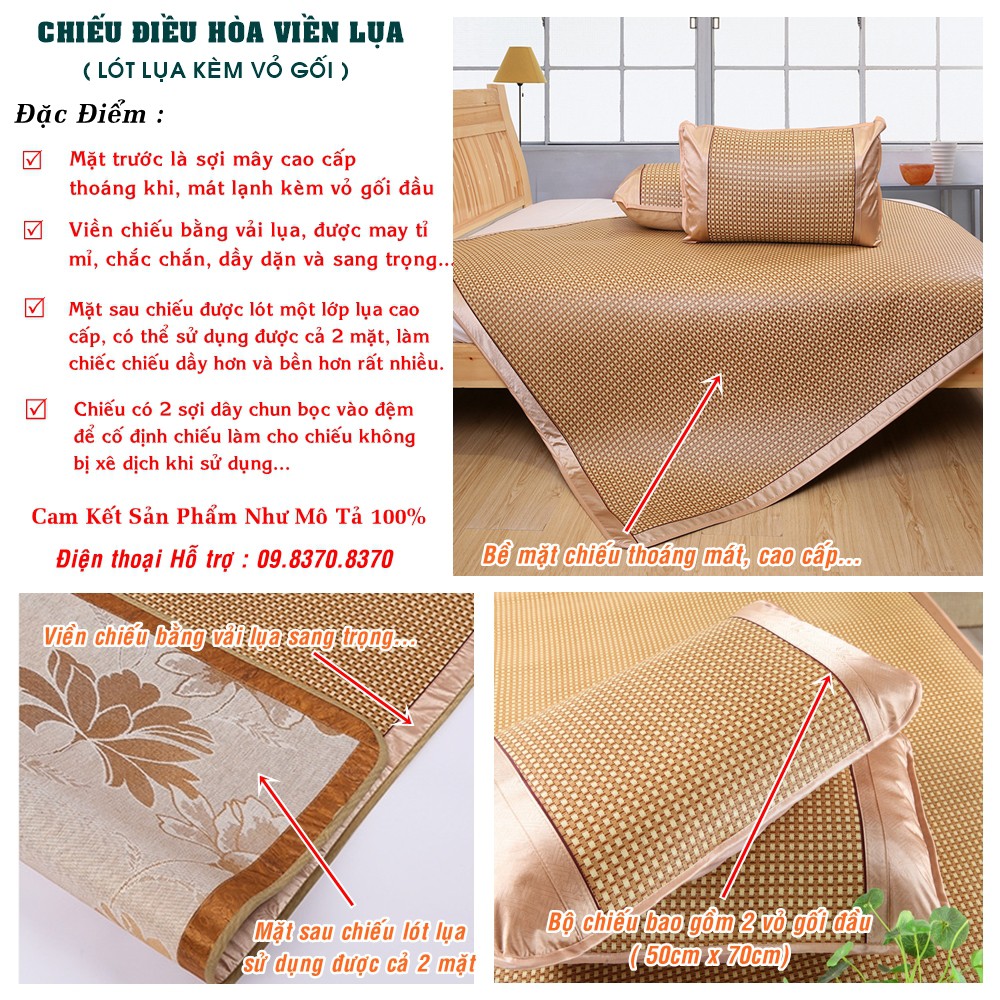 Đây là phân loại chiếu về sản phẩm giống như chiếu điều hòa viền lụa lót lụa, chỉ khác nhau là chiếu điều hòa bộ có thêm 2 vỏ gối mây kích thước 45cm x 65cm, ( riêng phân loại 80cm x 190cm , 90cm x 190cm, 1m x 190cm, 1m2 x 1m9 là có 1 vỏ gối ) vỏ gối được làm bằng chất liệu mây và lụa giống như chiếu điều hòa lụa