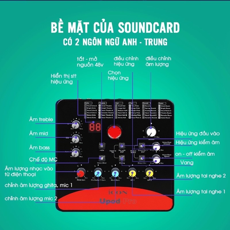 ✅ 1. GIỚI THIỆU SẢN PHẨM SOUND CARD ICON UPOD PROSound card Icon Upod Pro là sản phẩm nâng cấp của nhiều loại sound card kết hợp lại với 72 hiệu ứng âm thanh đầy hấp dẫn giúp các bạn có thể hát karaoke với mic thu âm hoặc micro karaoke, cũng như các bạn có thể live stream trên facebook – live stream trên bigo live hoặc các mạng live stream khác vô cùng hiệu quả và hay. Là lựa chọn thông minh sử dụng trong các phong thu chuyên nghiệp