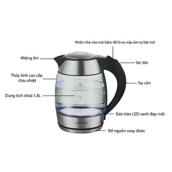 ✅Ấm điện đun nước thủy tinh Lock&Lock EJK418SLV 1.8L 1850W (Màu bạc) sử dụng cụm đèn LED màu xanh dương sáng lên khi đun nước, tạo nên vẻ độc đáo hiện đại hơn cho sản phẩm, cùng với thiết kế tay cầm cách nhiệt giúp đảm bảo an toàn cho người sử dụng và làm tăng tuổi thọ sản phẩm