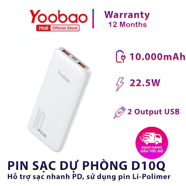 Điện Thoại & Phụ Kiện > Phụ kiện > Sạc dự phòng & Pin > Sạc dự phòng || [CHÍNH HÃNG-BH 12 THÁNG] Sạc dự phòng 10000mAh Yoobao D10Q 2 cổng USB - Hàng chính hãng - Bảo hành 12 tháng 1 đổi 1Còn hàng