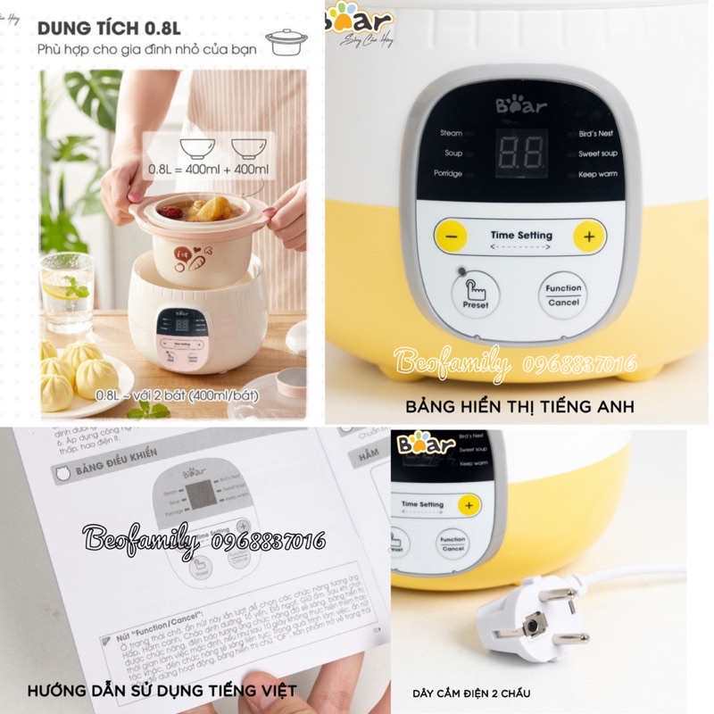 Giới thiệu (CHÍNH HÃNG BH 18 THÁNG) Nồi Nấu Cháo Chậm Đa Năng Bear, Nồi Hầm, Hấp, Ninh Cách Thủy, Dung tích 0,8L