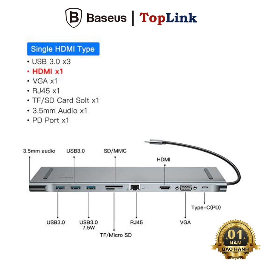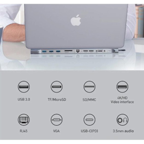 - Bộ Hub đa năng Baseus Enjoyment Series Type C chuyển đổi các cổng Thunderbolt trên Macbook Pro 2016/2017/2018 hay cổng USB Type C trên các smartphone/ Tablet/ Laptop Android/Windows . Bội HUB chuyển đổi có ngỏ vao là cổng USB Type C và ngỏ ra là hầu hết các chuẩn giao tiếp phổ thông hiện nay như : USB 2.0/ USB 3.0 / HDMI/ VGA/ USB 3.0/ Card Reader/ RJ-45/AUX 3.5mm ...