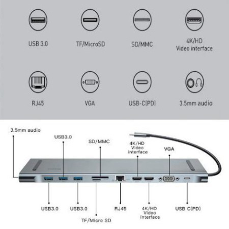 Giới thiệu [CHÍNH HÃNG] Bộ Chia Hub Đa Năng 10 - 11 Cổng: USB 3.0 / Khe Cắm Thẻ Nhớ SD/TF / RJ45 / HDMI / VGA / Type-C / Jack 3.5mm