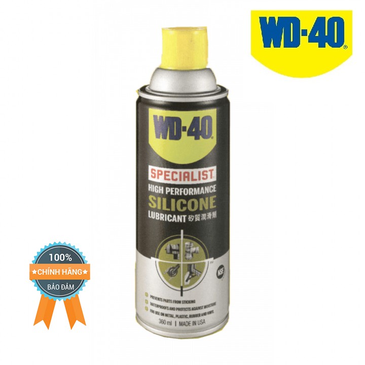 [ CHÍNH HÃNG] Chai Chất Bôi trơn Silicon, tác dụng cao WD-40 Specialist High Performance Silicone Lubricant (360ml)HB AUTO chuyên phân phối sản phẩm Chất Bôi trơn Silicon, tác dụng cao WD-40 Specialist High Performance Silicone Lubricant 360ml là loại hóa chất không làm biến màu, có công thức chế tạo đặc biệt nhằm cung cấp giải pháp bôi trơn vượt trội mà không nhiểm bụi bẩn và còn có tác dụng bảo vệ chống ẩm.