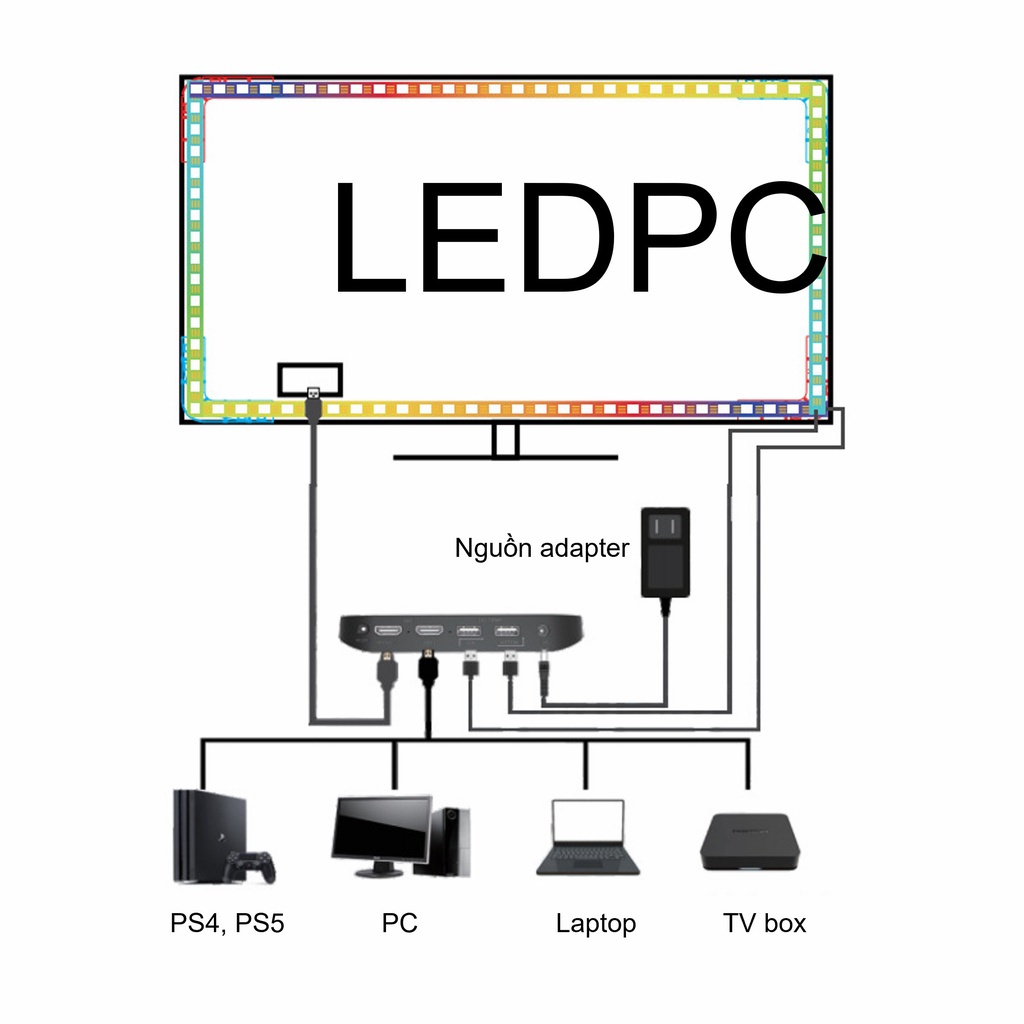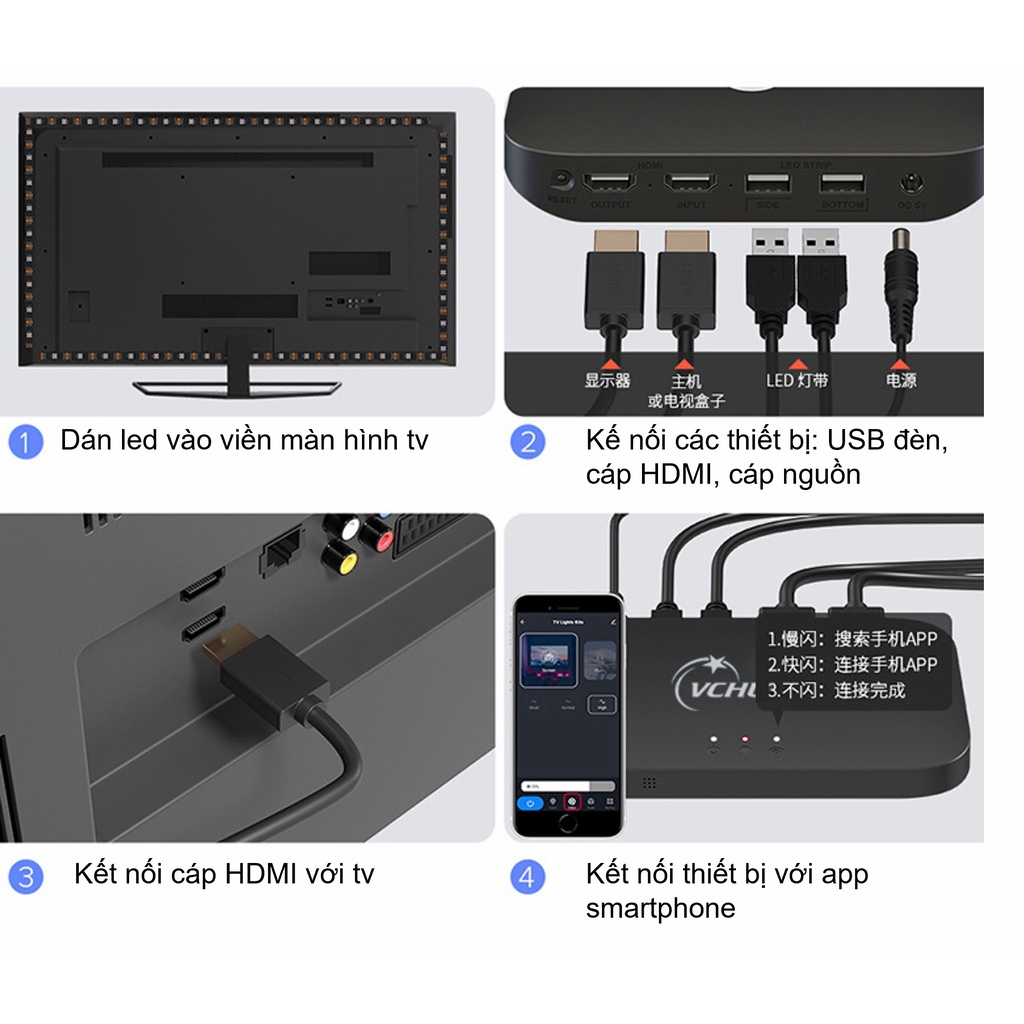- Lắp đặt đơn giản (không cần cài phần mềm): Dán led vào sau màn TV, kết nối cáp bộ điều khiển và sử dụng
