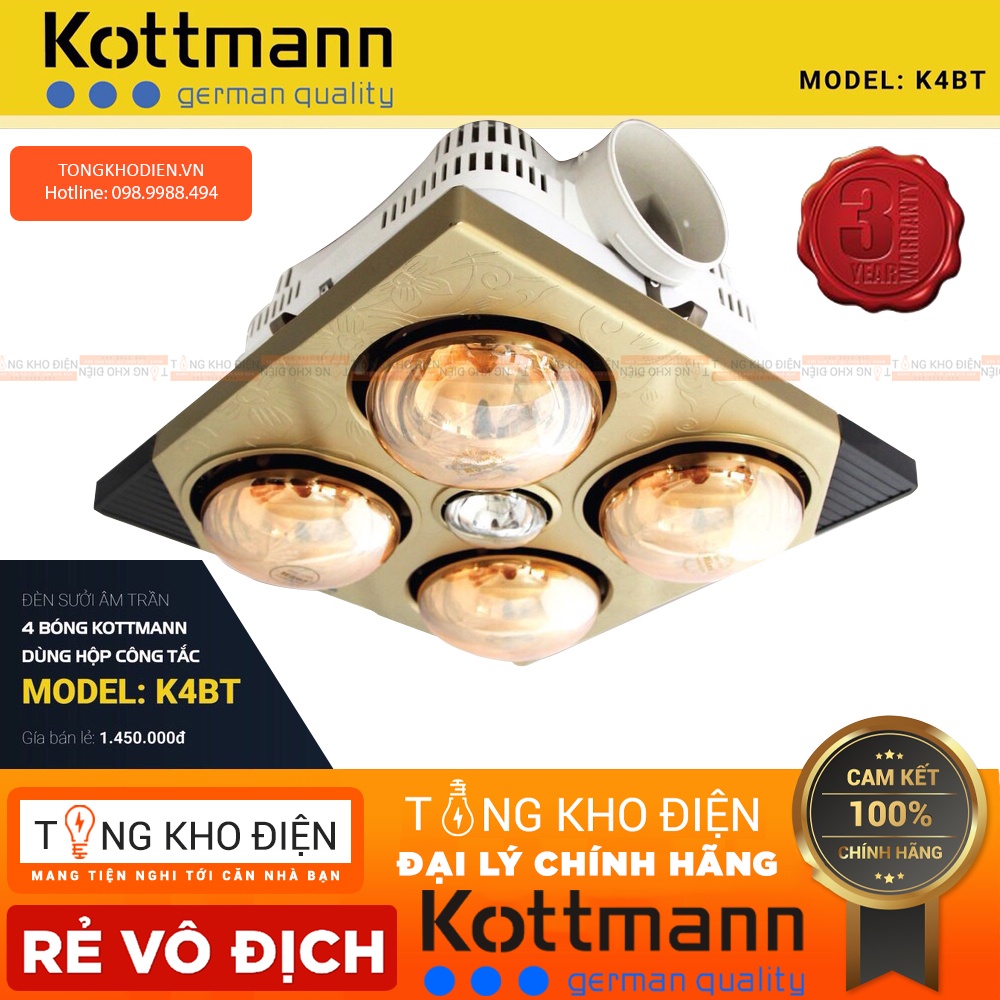 [CHÍNH HÃNG] Đèn sưởi nhà tắm Kottmann 4 Bóng Âm Trần Hồng Ngoại K4BT có quạt thông gió và đèn chiếu sáng