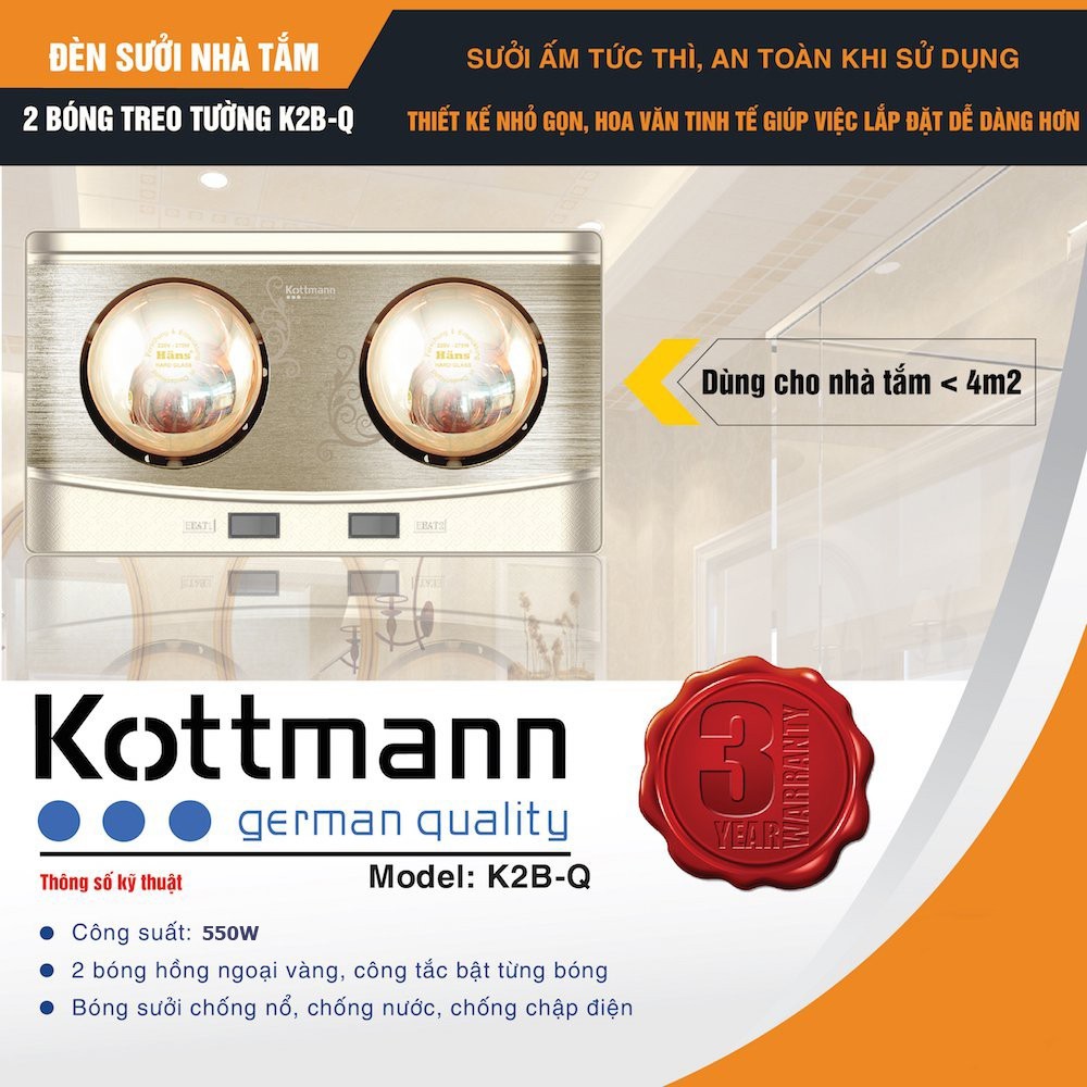 [CHÍNH HÃNG] ĐÈN SƯỞI NHÀ TẮM HỒNG NGOẠI KOTTMANN 2 BÓNG MẠ VÀNG K2B-Q