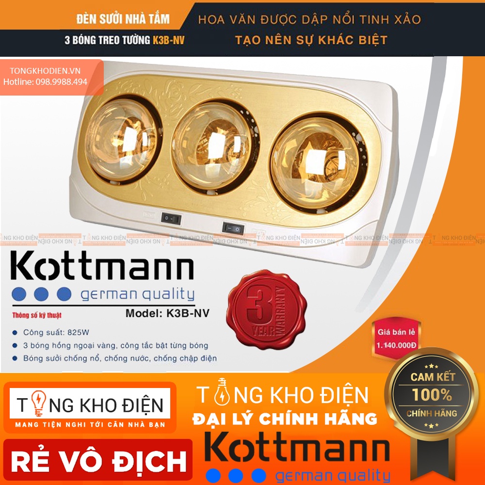 ☄️ Đèn sưởi nhà tắm Kottman K3B-NV tia hồng ngoại 3 bóng vàng💧 Sưởi ấm tức thì