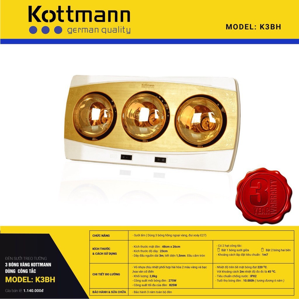 Thiết Bị Điện Gia Dụng > Thiết bị điện gia dụng lớn > Máy sưởi || [CHÍNH HÃNG] ĐÈN SƯỞI NHÀ TẮM HỒNG NGOẠI KOTTMANN 3 BÓNG MẠ VÀNG K3B-HCòn hàng