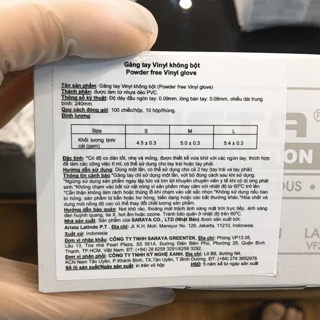 [CHÍNH HÃNG] Găng Tay VINYL KHÔNG BỘT Dùng Trong Thực Phẩm, Vệ Sinh NHẬT BẢN, Xuất xứ INDONESIA 100 CHIẾC/HỘPThương hiệu: SARAYA.